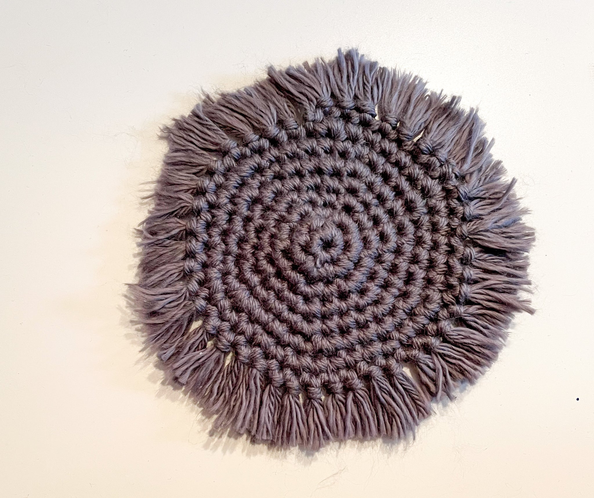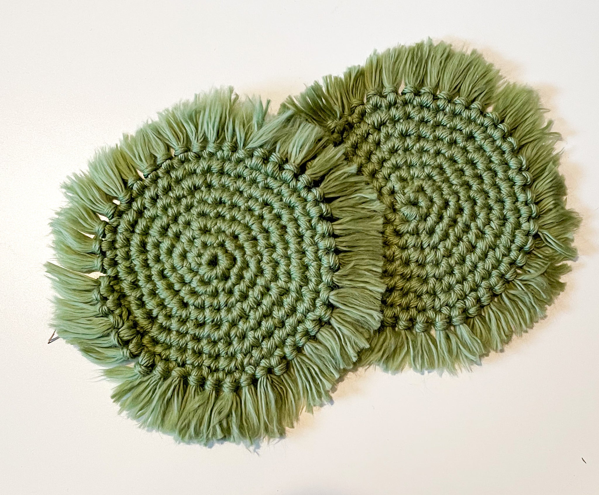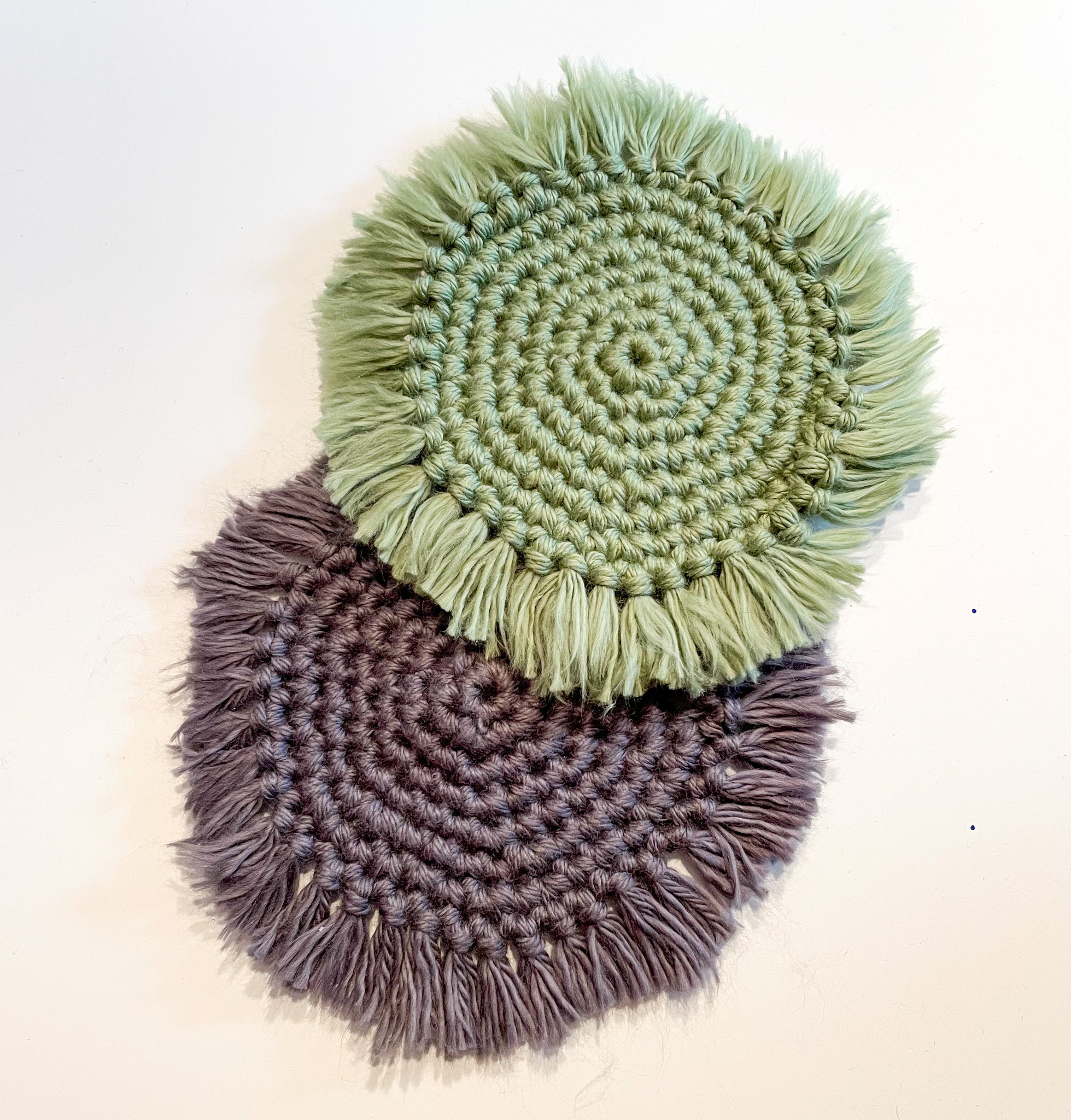 Set of 2 thick coasters made with two strands of 100% cotton yarn. Easily washable (machine wash, lay to dry) and helps protect your surface from any condensation from your beverages.