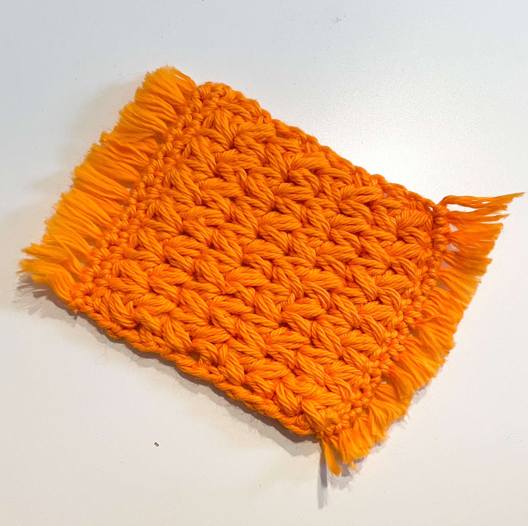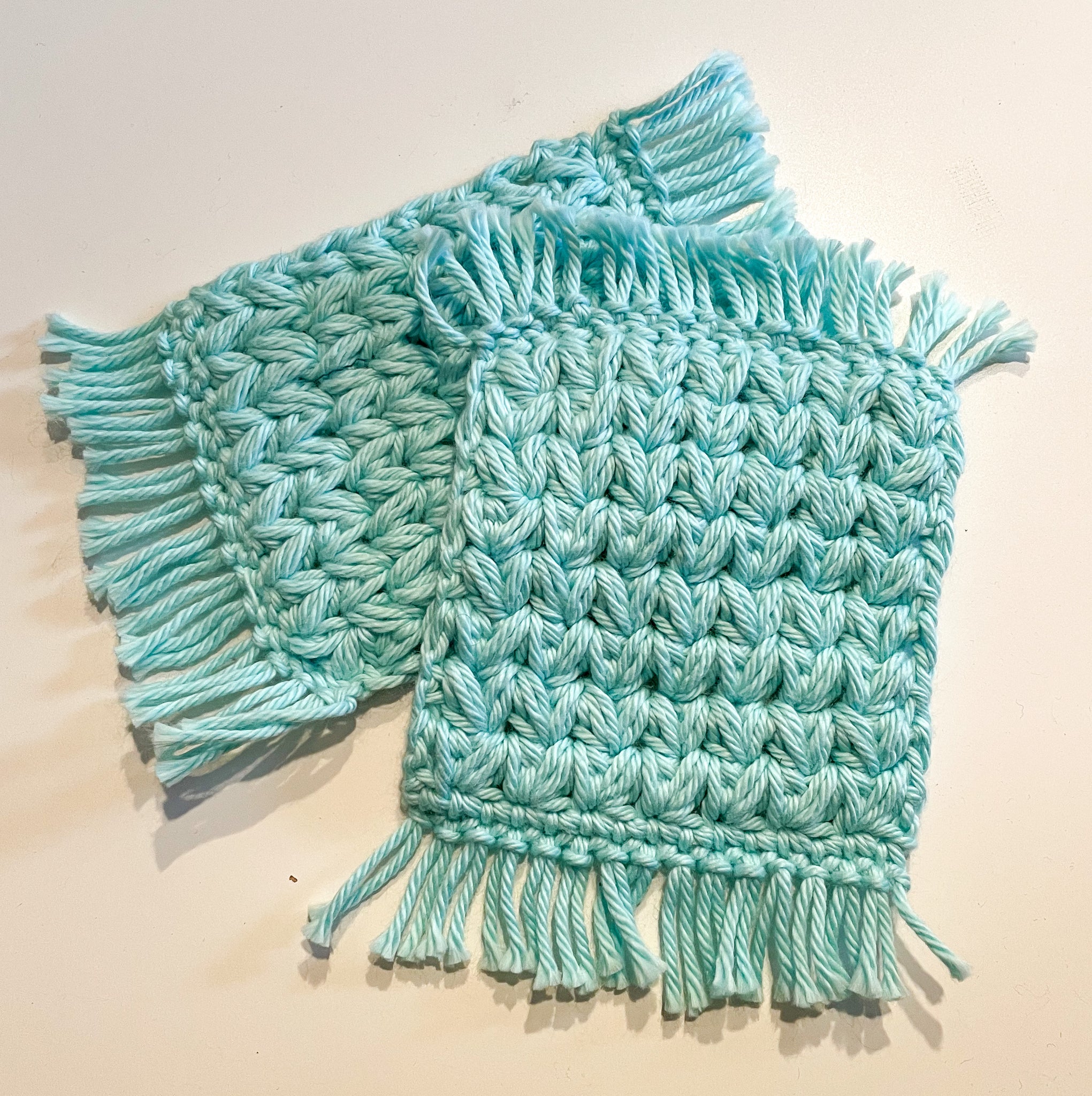 Small rectangular coasters to protect your surfaces and absorb condensation. Comes in a set of 4. Made with 100% cotton yarn. Hand wash and lay to dry. Can comb frayed fringe with a fine tooth comb to lay flat again. Can be made in most colors and can come with frayed or unfrayed fringe.